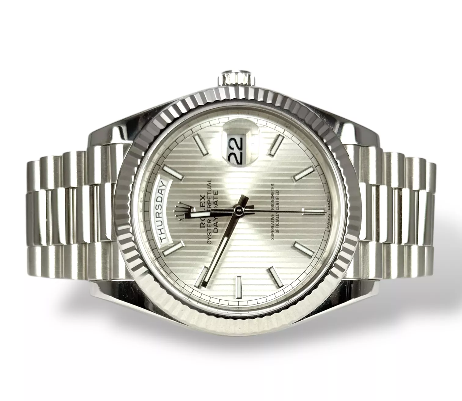 ROLEX 2015 Day-Date 40, 228239, Silver Baton, 2023 Rolex Service, Box & Papers