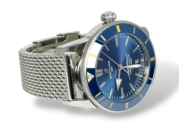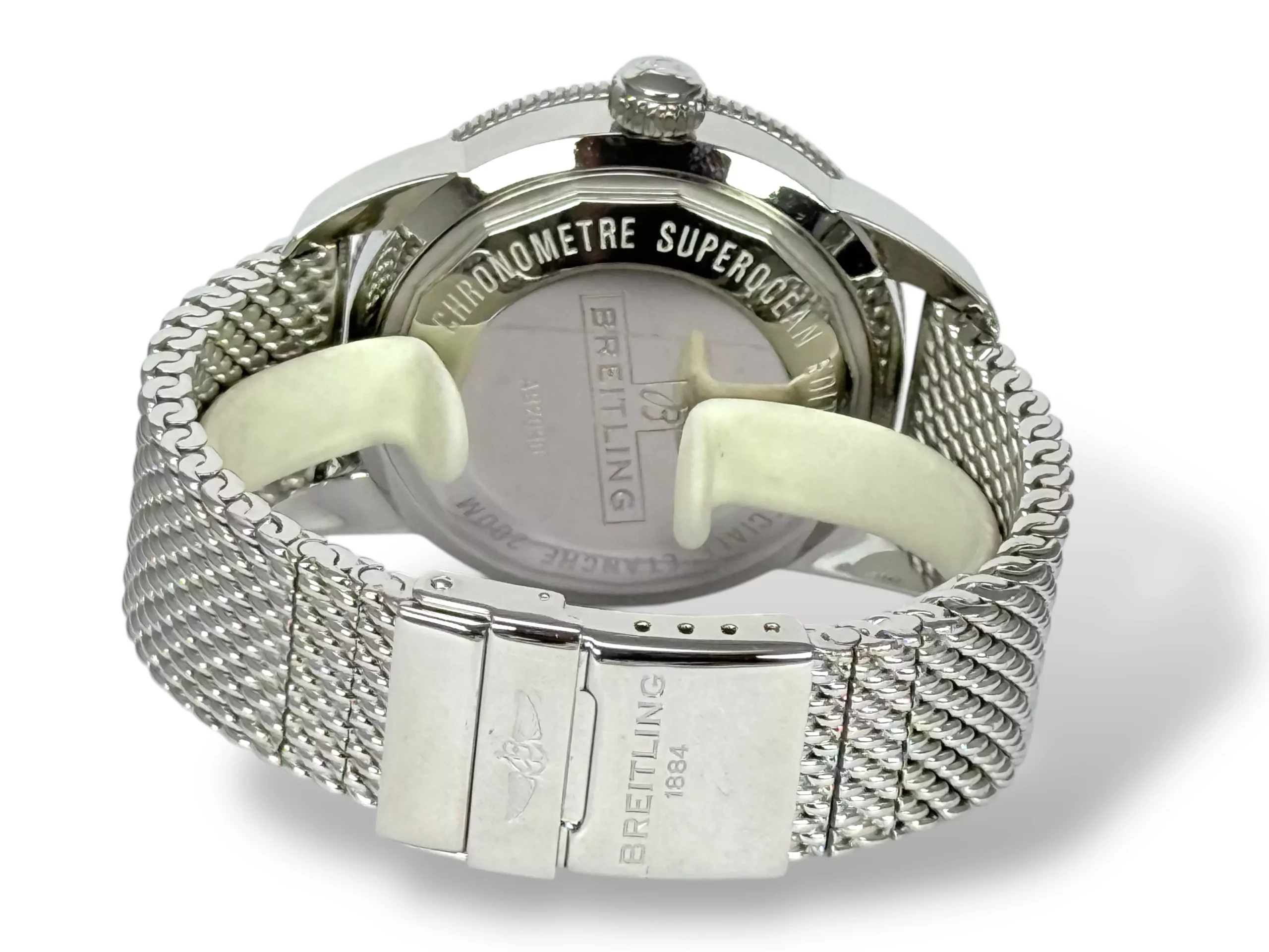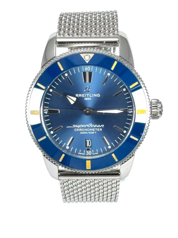 For sale is a stainless steel Breitling Superocean Heritage 44 on stainless steel bracelet with blue dial, supplied wallet, booklet, tag, original Breitling box and papers (card)