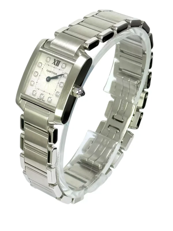 For sale is an excellent example of a ladies stainless steel Cartier Tank Francaise with quartz movement, Diamond dot Dial supplied with papers