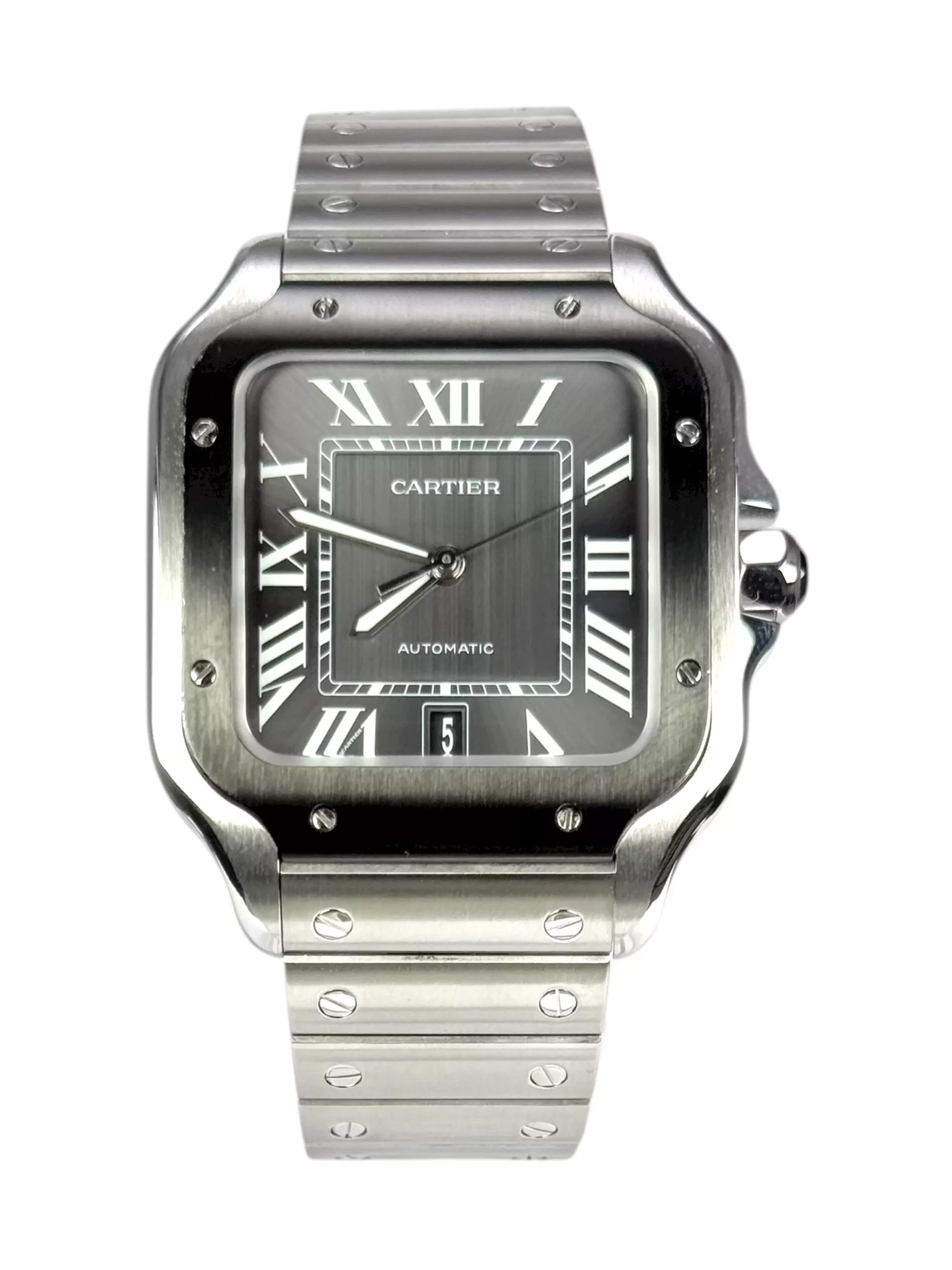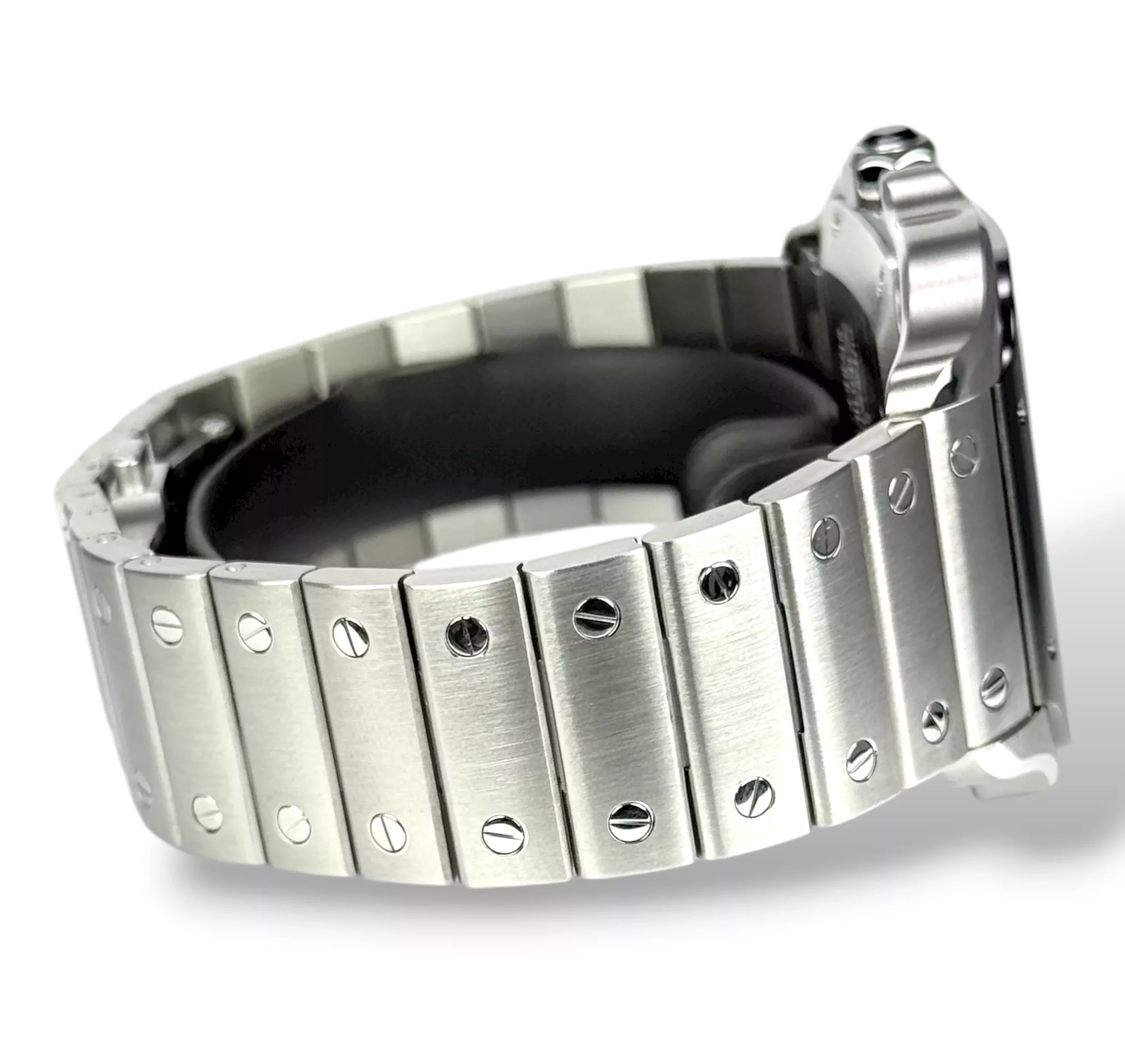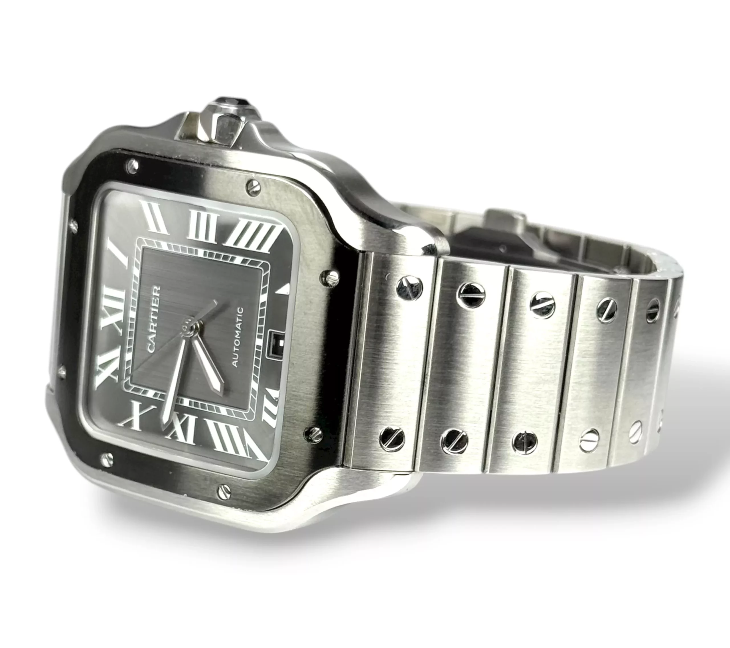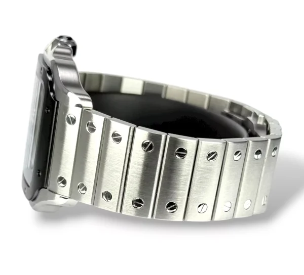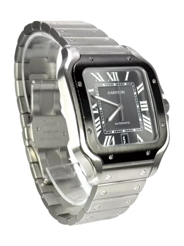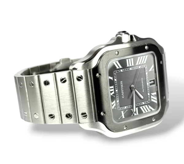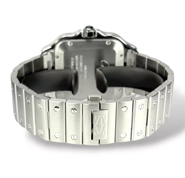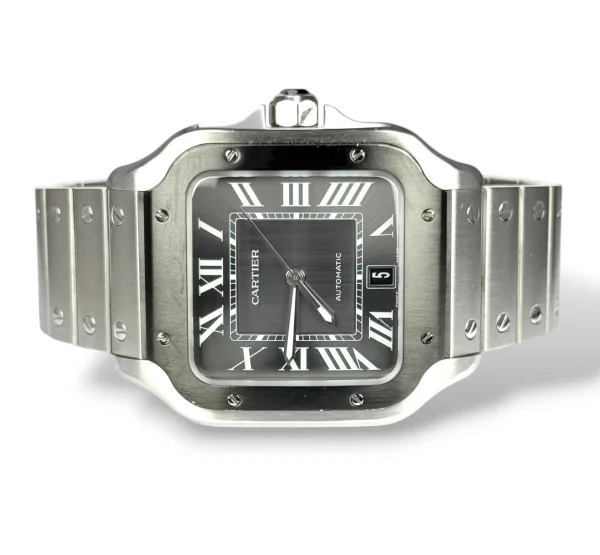For sale is a stainless steel Cartier Santos XL with rhodium ADLC Bezel and rhodium dial, supplied with original box, extra strap, tag, rubber with deployant clasp, booklet and original papers.