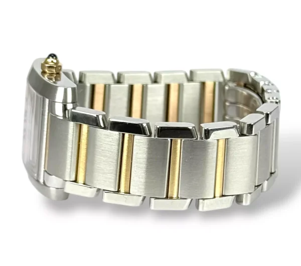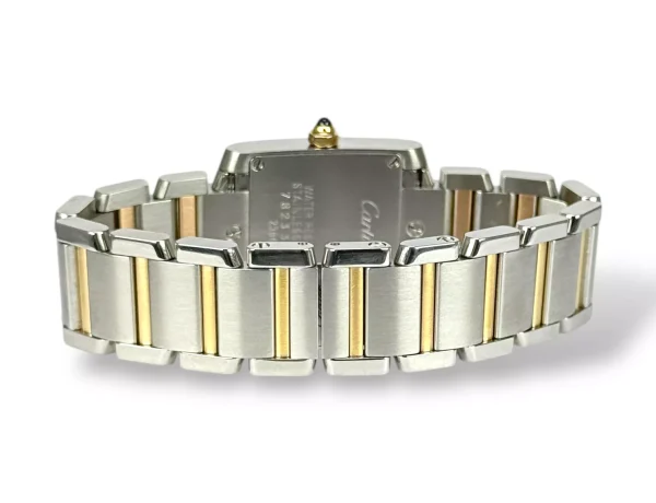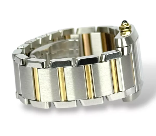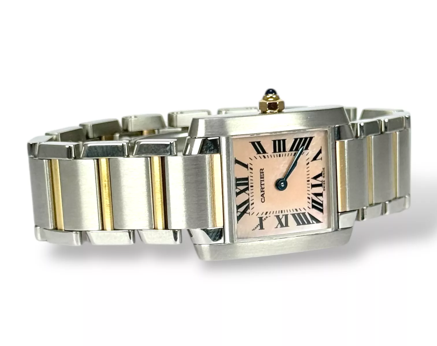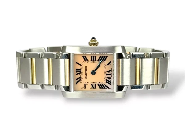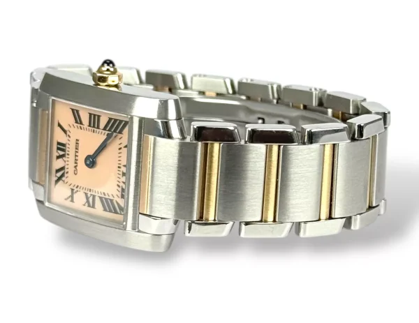 For sale is a Excellent example of a stainless steel Cartier Tank Francaise ladies watch with stainless steel bracelet and rose gold, pink mother of Pearl dial supplied with Cartier service pouch Please note this watch is only 13cm, and will require extra links, price reflects this