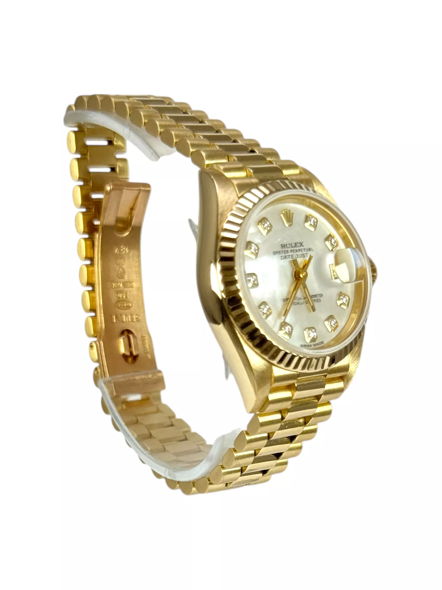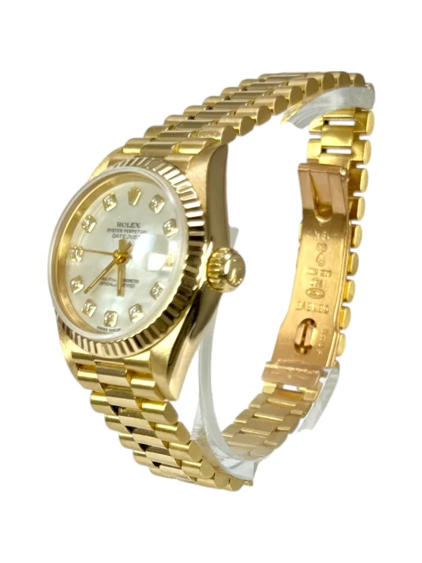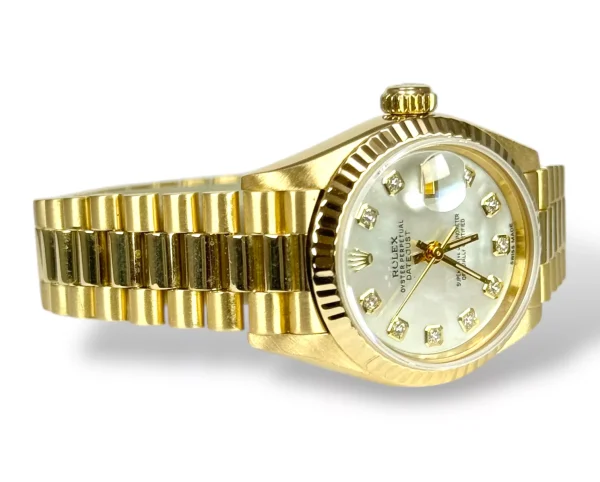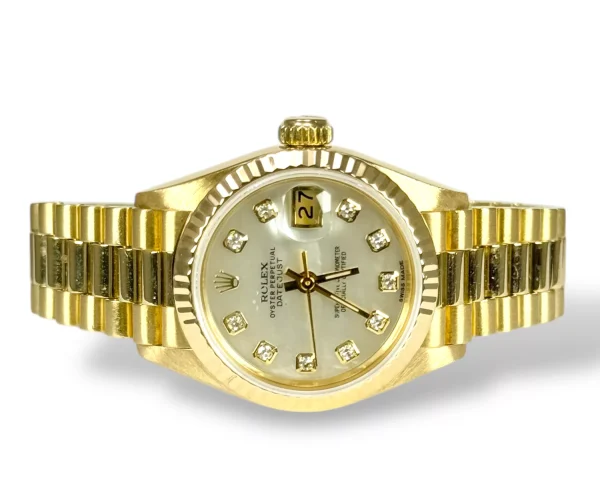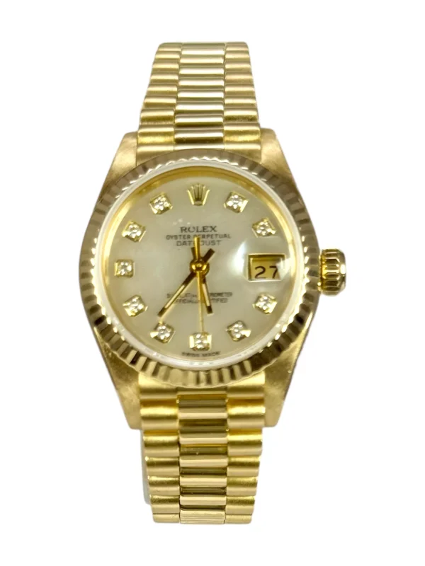 For sale is a Rolex Datejust 26 with President bracelet and genuine Mother of Pearl diamond dot dial, supplied with wallet, original box and original papers