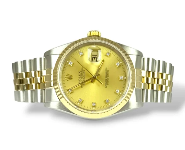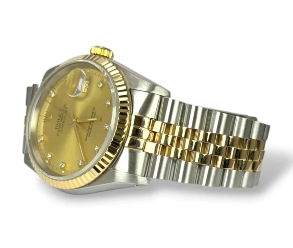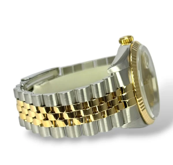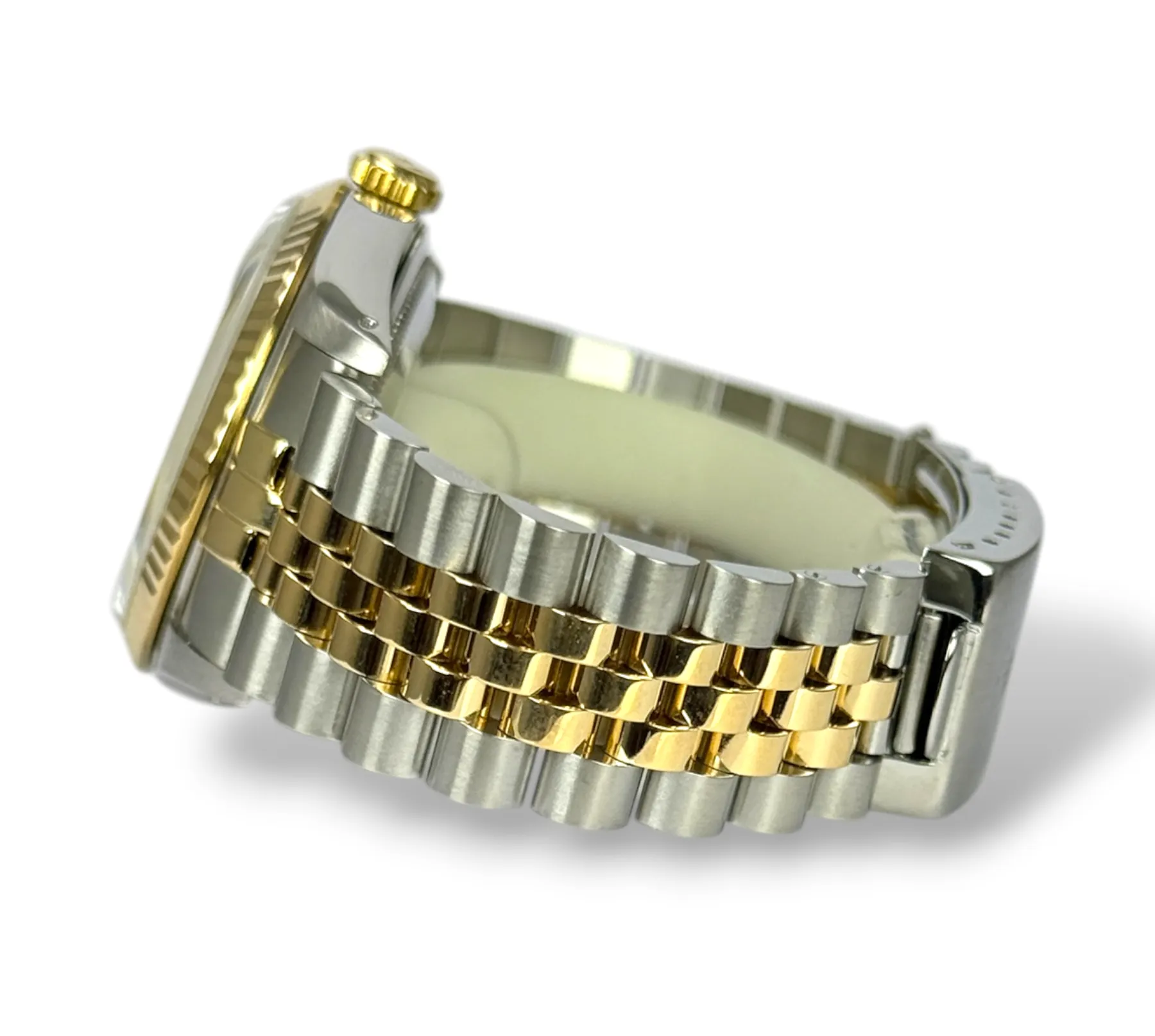 For sale is a Excellent example of a stainless steel and yellow gold Rolex Datejust 36, Jubilee bracelet with a champagne diamond dot dial, supplied with original box and original papers