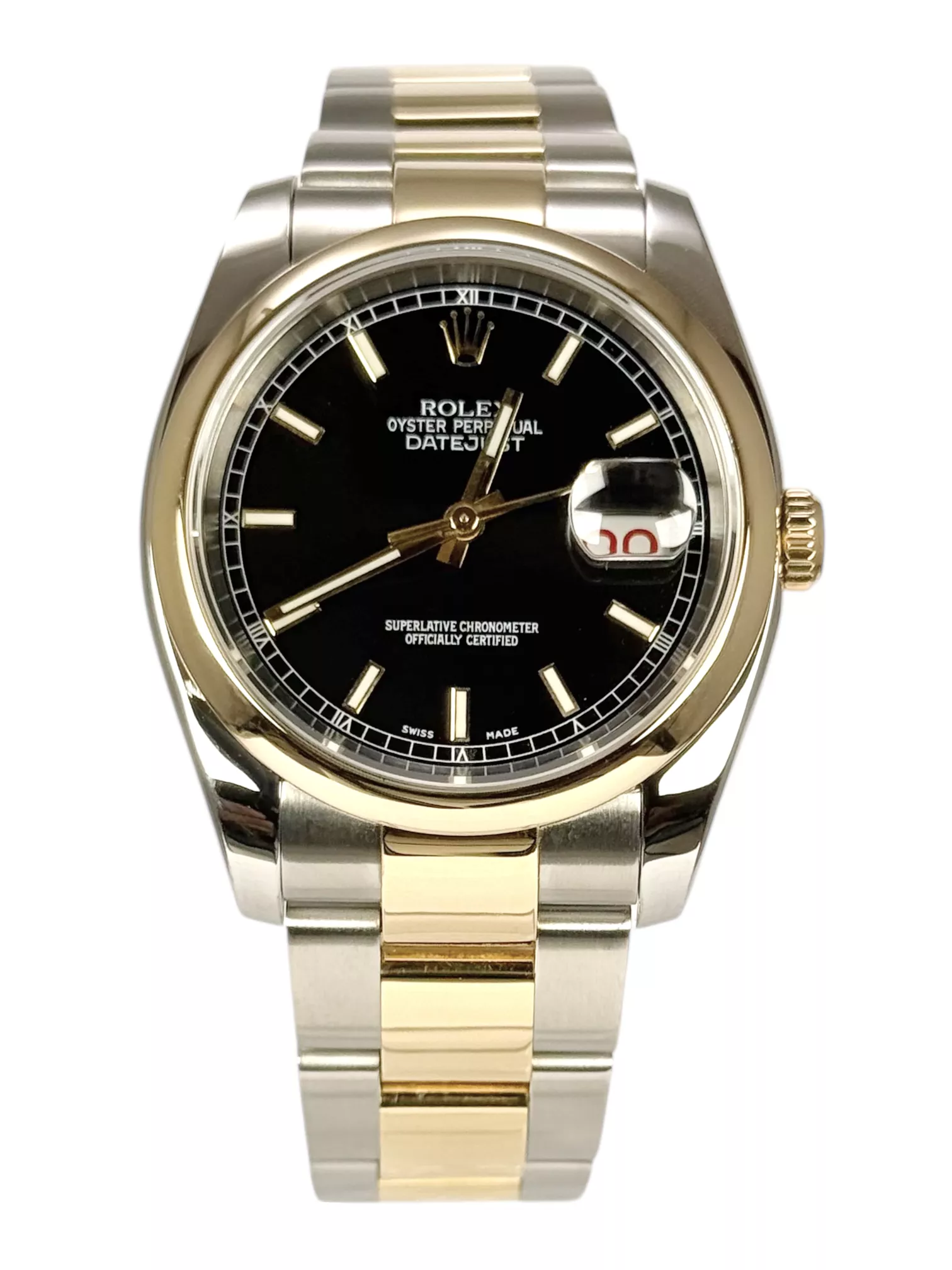 For sale is a Excellent example of a stainless steel and yellow gold Rolex Datejust 36 with Oyster bracelet, smooth gold bezel, black baton dial and supplied with both booklets, both swing tags, wallet, original box and original papers