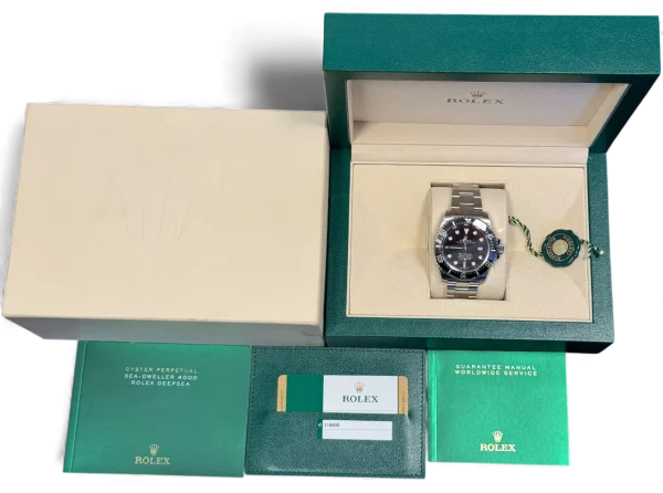 For sale is an excellent example of a Rolex Sea-Dweller SD4000, black dial, supplied with original box, both booklets, green tag, wallet and original papers (card)