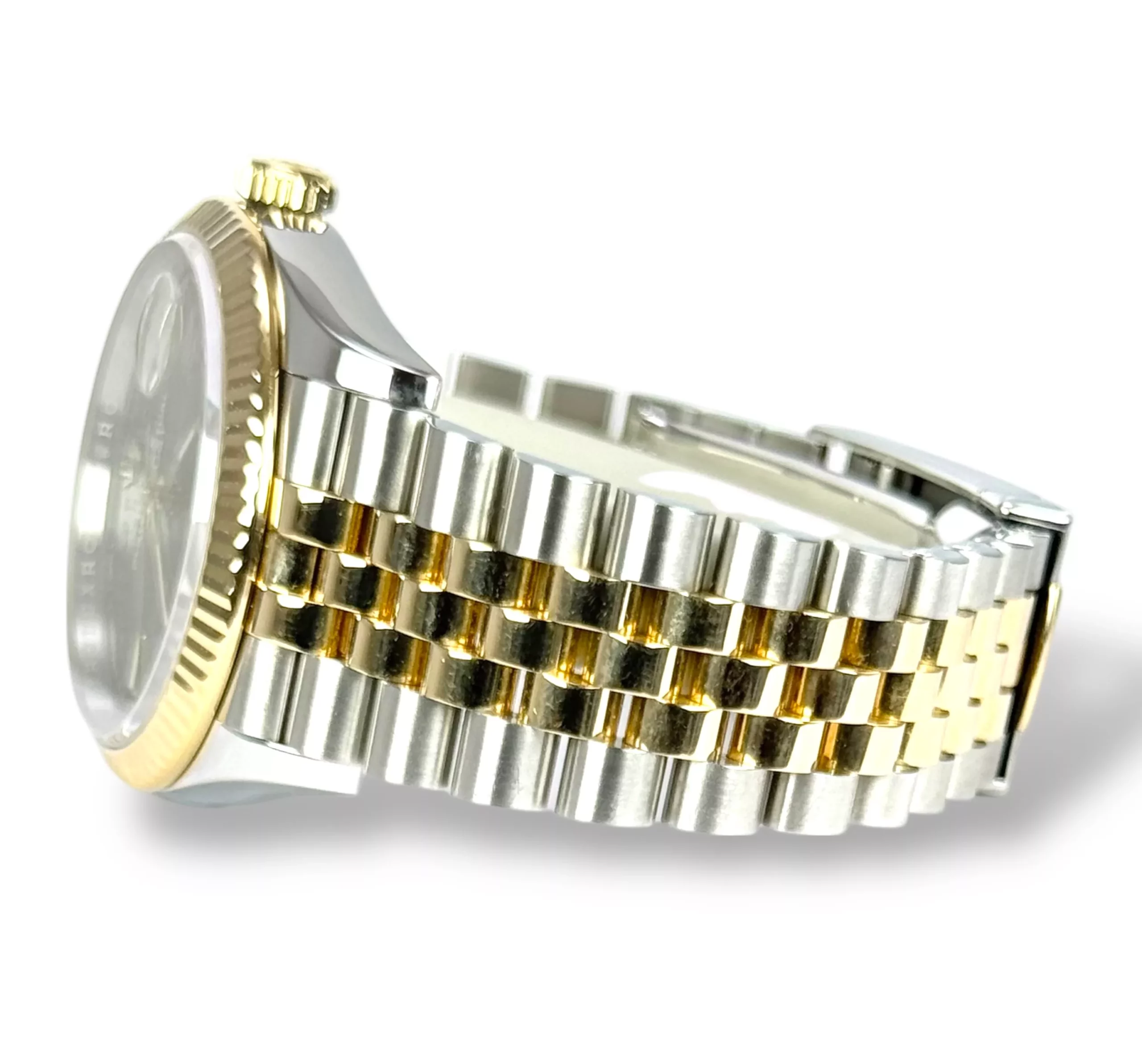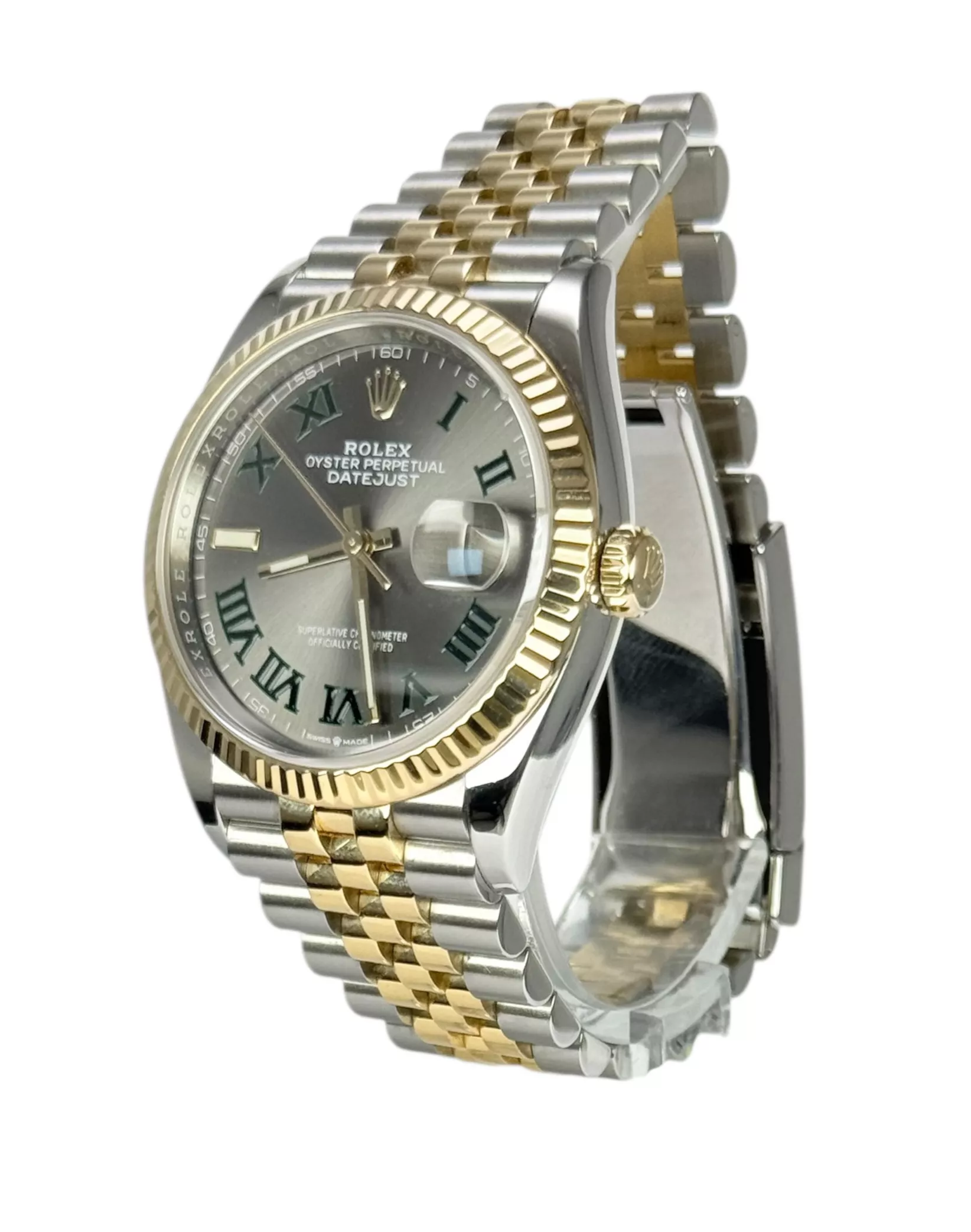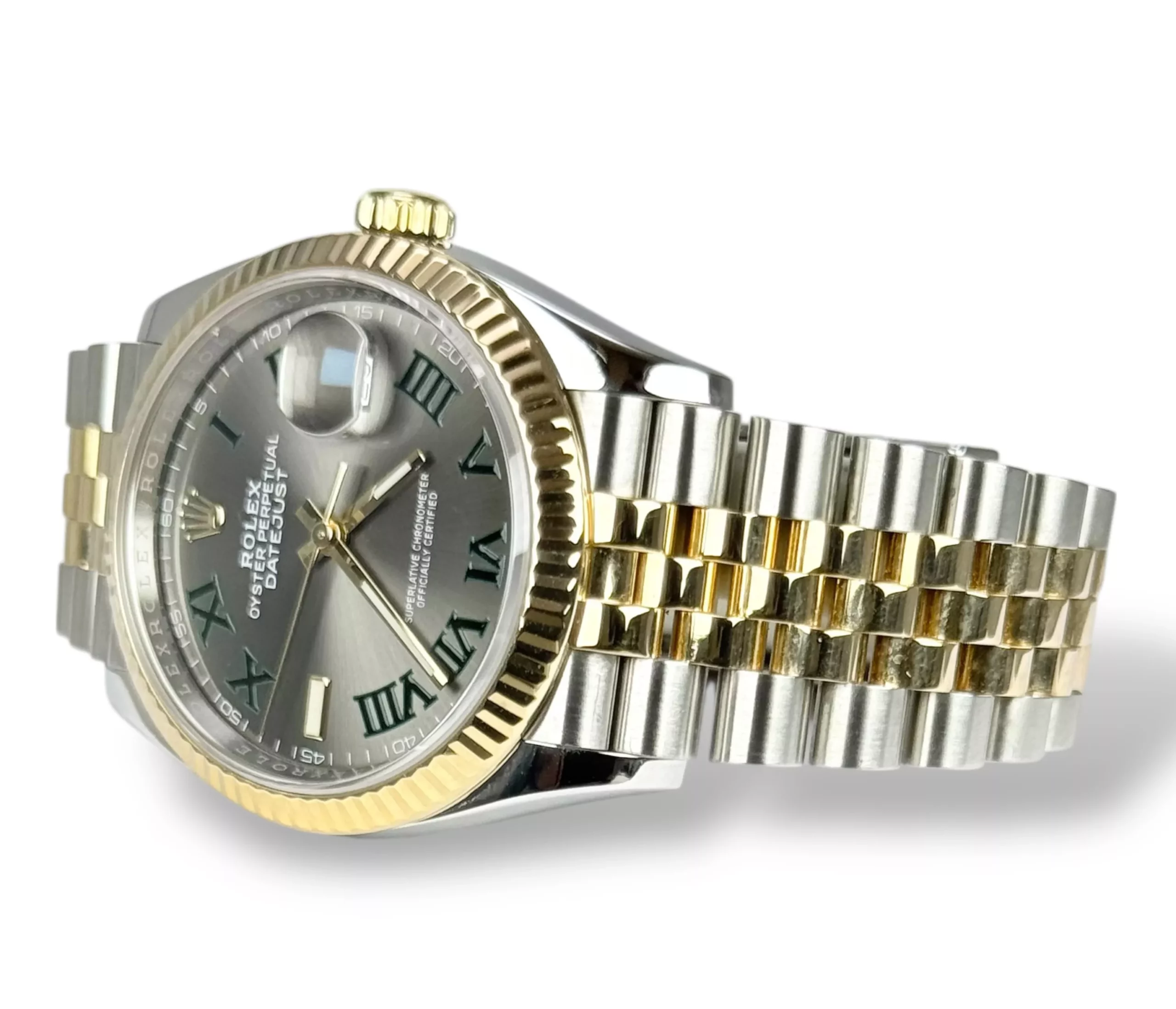 For sale is a Excellent example of a stainless steel and yellow gold Rolex Datejust 36, Jubilee bracelet with the “Wimbledon” grey roman dial, supplied with wallet, both booklets, green tag, original box and papers (card)