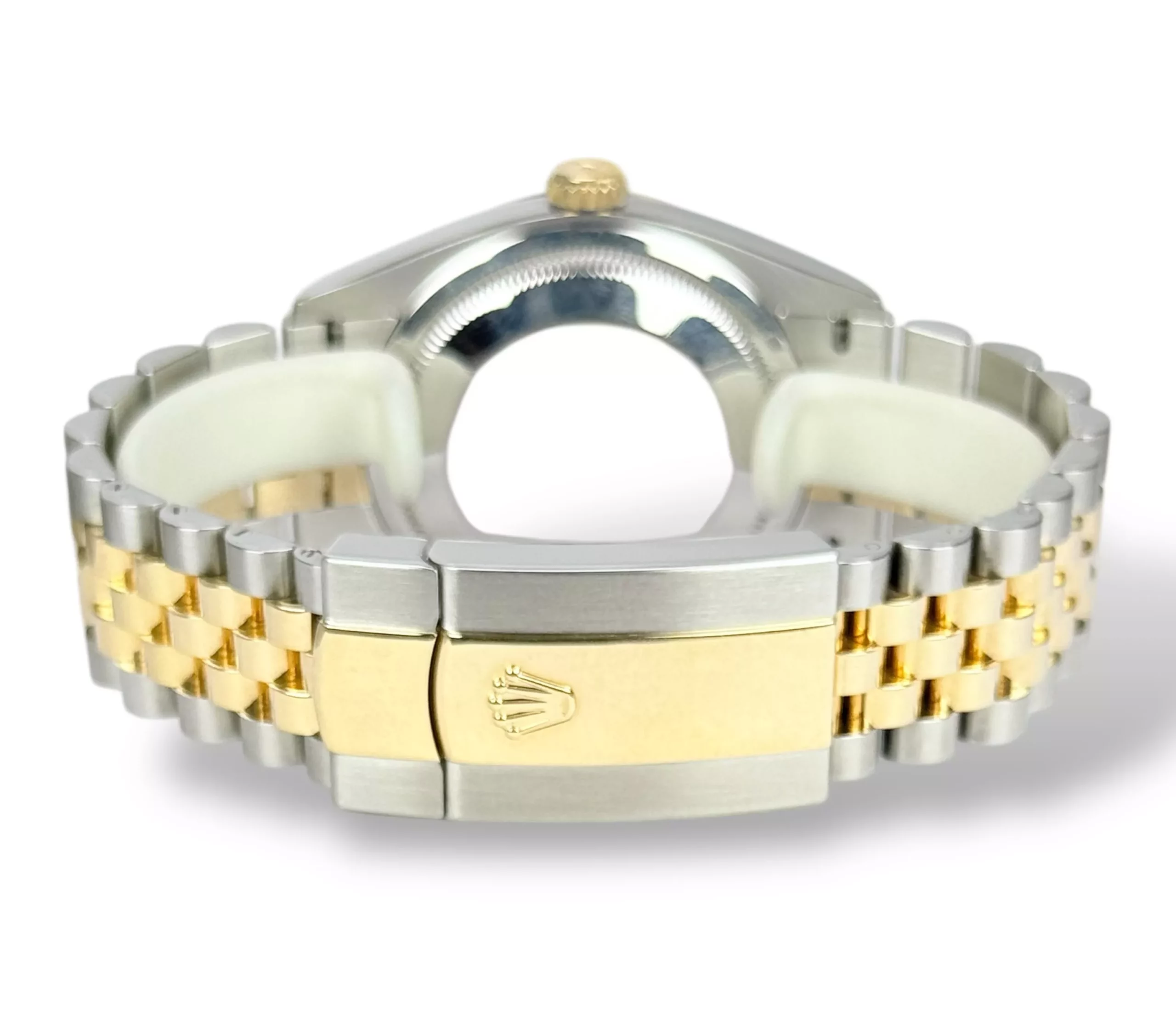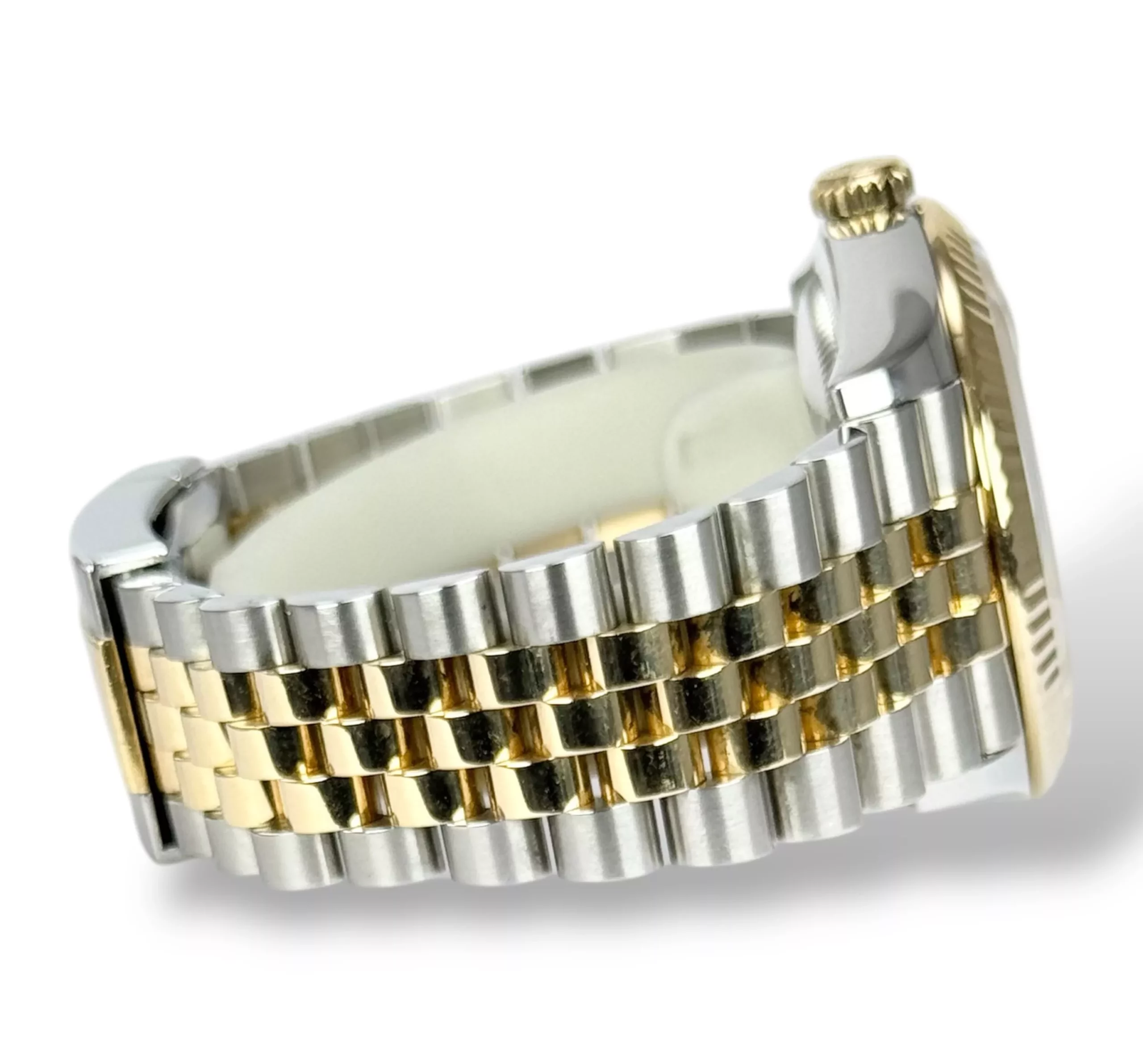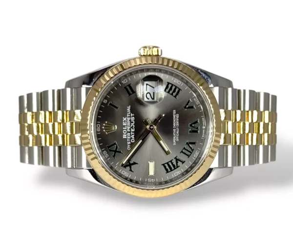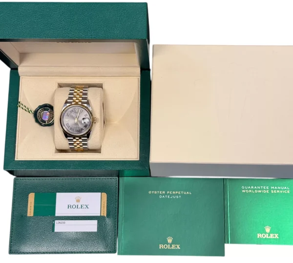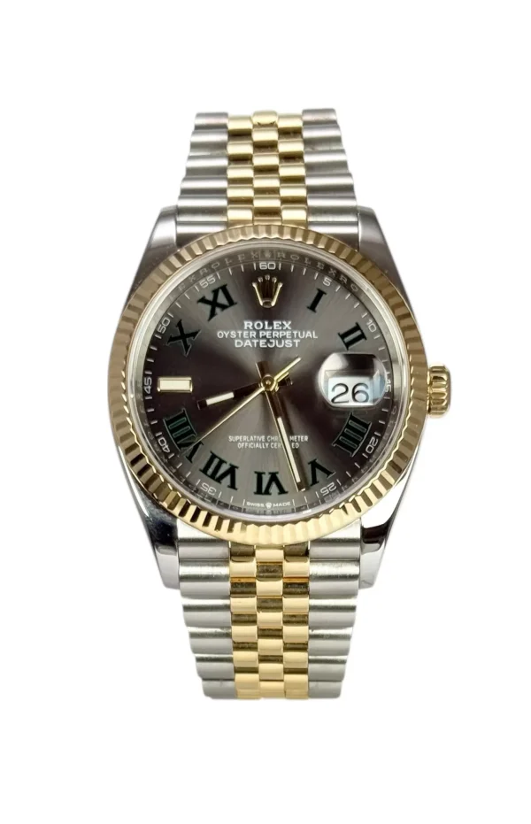 For sale is a Excellent example of a stainless steel and yellow gold Rolex Datejust 36, Jubilee bracelet with the “Wimbledon” grey roman dial, supplied with wallet, both booklets, green tag, original box and papers (card)