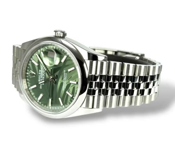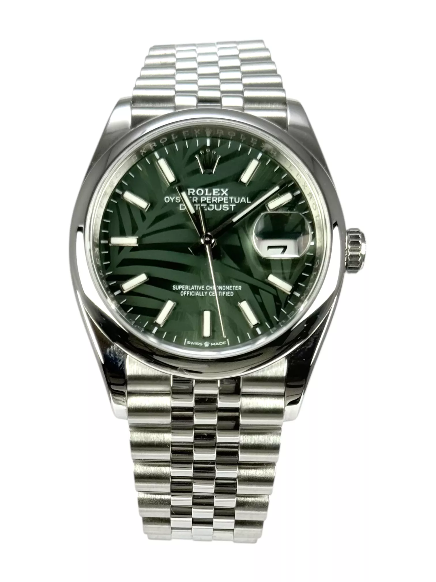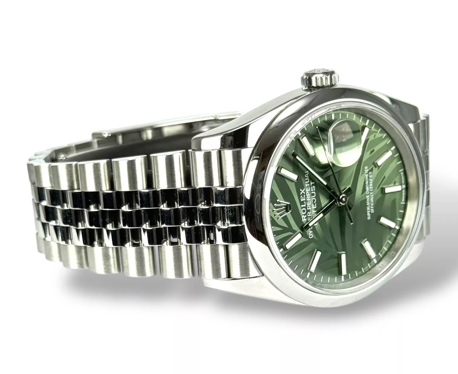 For sale is an excellent example of a stainless steel Rolex Datejust 36, Jubilee bracelet with green “Palm” dial, supplied with both booklets, both tags, wallet, original box and original papers (card)