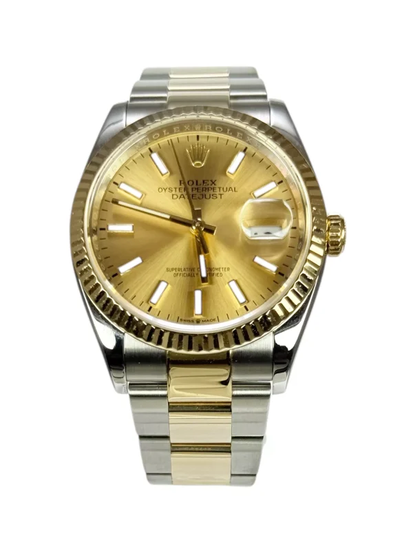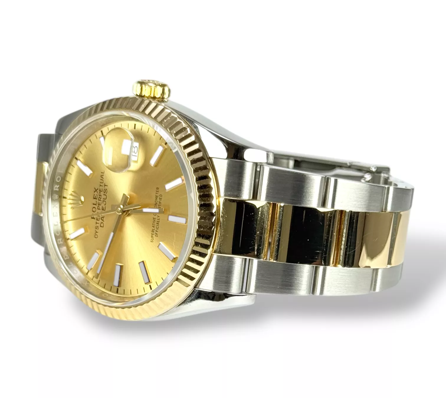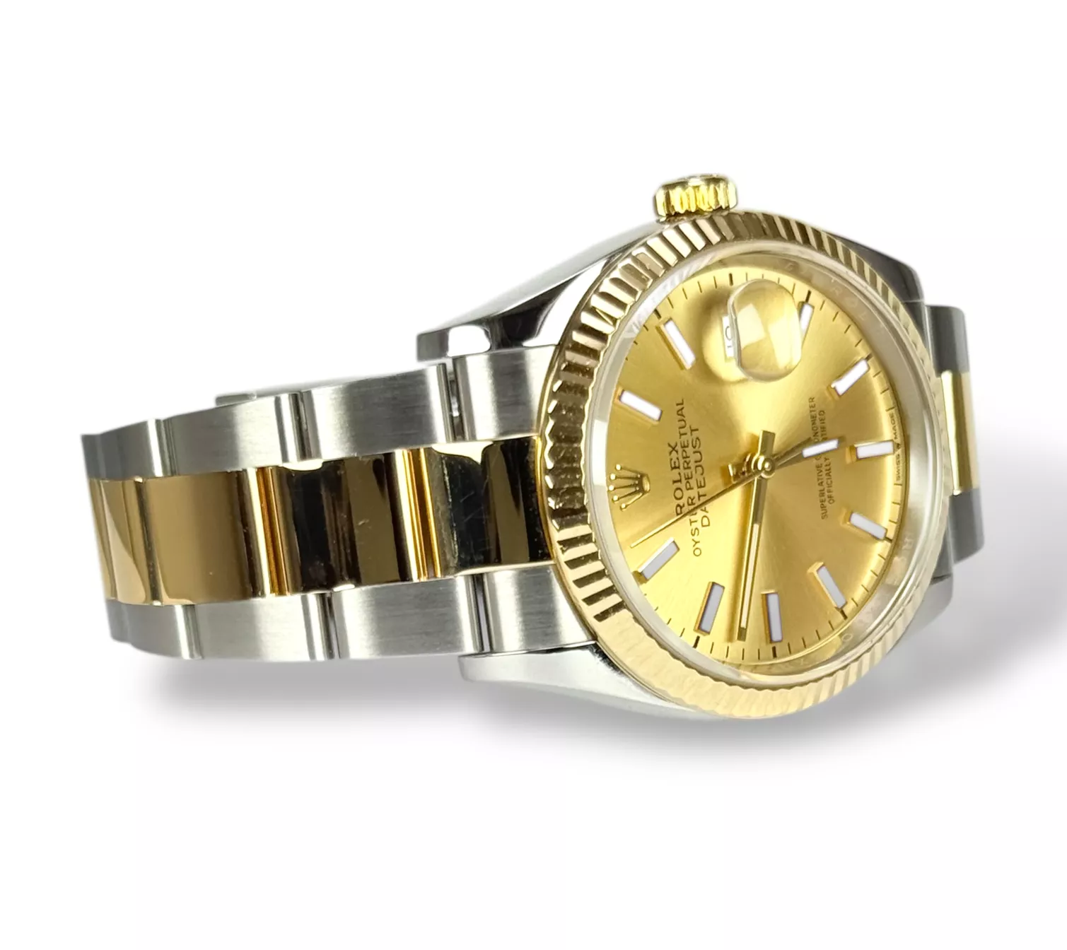 For sale is a Excellent example of a stainless steel and yellow gold Rolex Datejust 36, Oyster bracelet with a champagne baton dial, supplied with original box